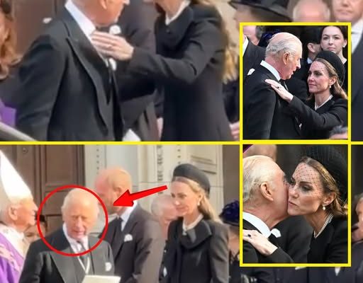 Kate supports her father-in-law King Charles in a tender moment, as Queen Camilla was forced to miss the funeral due to an illness
