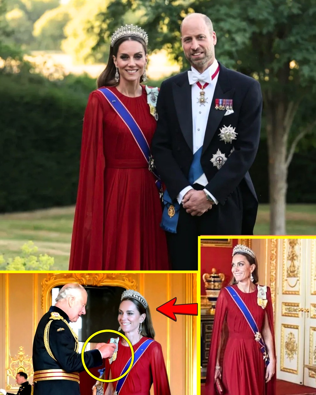 Catherine stunned in a custom crimson gown by Sarah Burton for Givenchy, featuring a cape-like train and sculpted silhouette that highlighted her graceful stature. But what drew just as much attention as the gown was a special royal accessory: the Royal Family Order of King Charles.