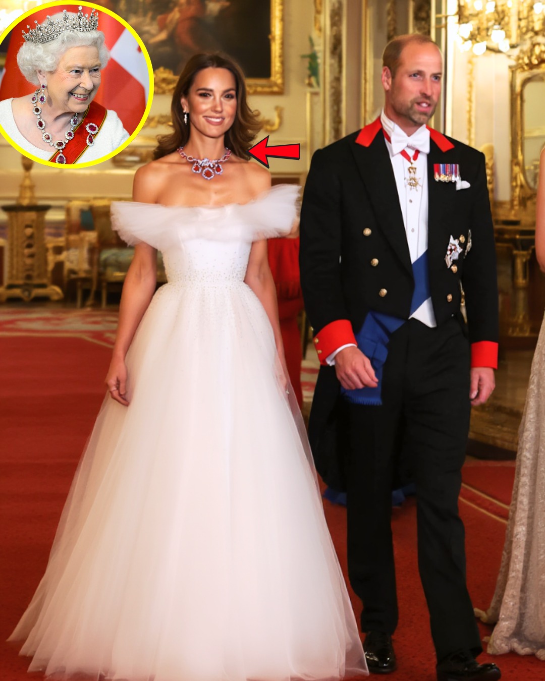 In a dazzling display of elegance and regal splendor, HRH Catherine, Princess of Wales, left the world speechless at the recent State Gala Dinner, stepping into the spotlight in a breathtaking shimmering white gown that seemed to capture the very essence of starlight. But it wasn’t just the gown that had jaws dropping—it was the jaw-dropping oversized ruby and diamond necklace, a treasured piece from the late Queen Elizabeth II’s collection, that stole the show and sent a clear message: Catherine is a royal style icon like no other.