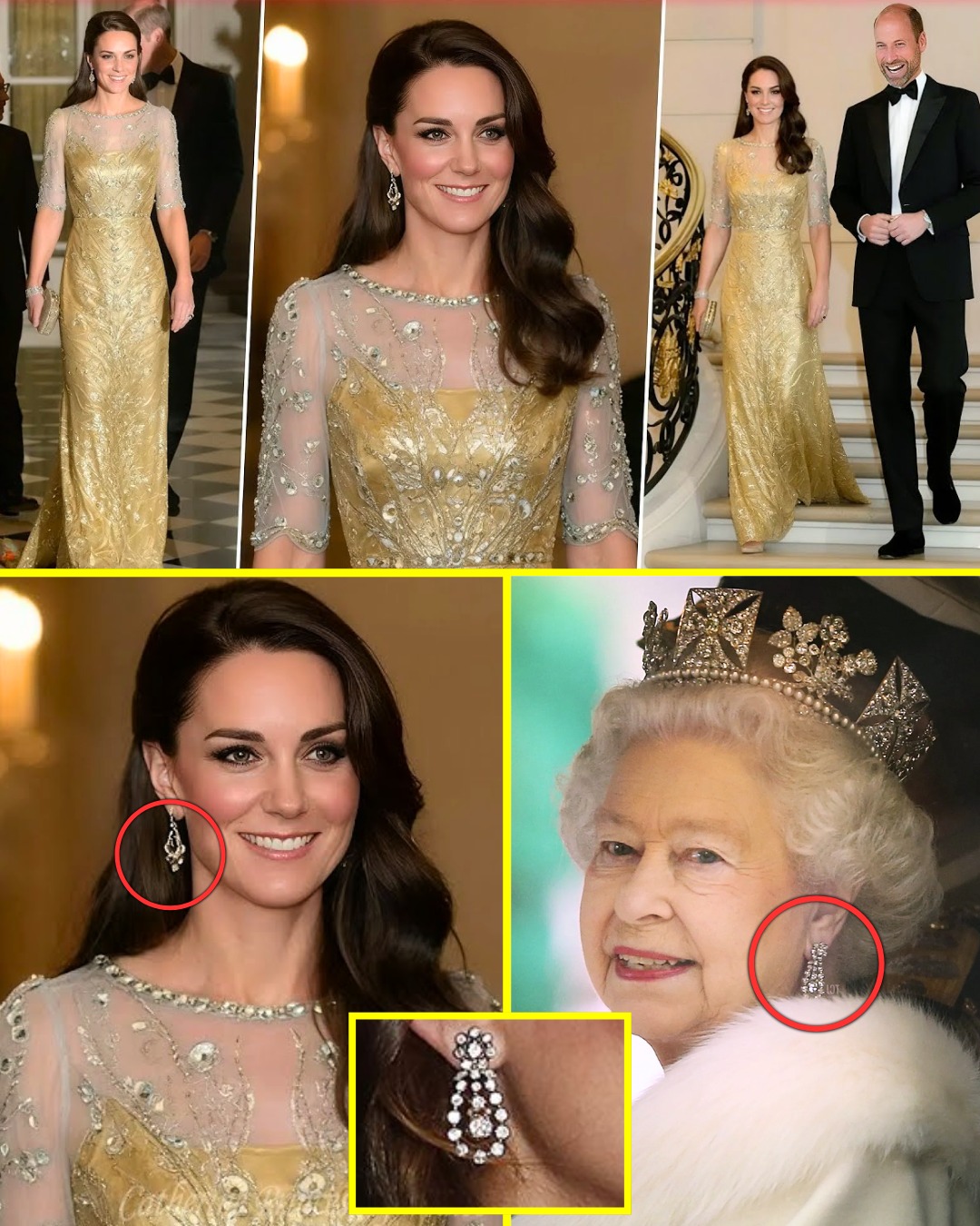 The Prince and Princess of Wales brought regal splendor to a black-tie dinner at the British Embassy in Paris, where Princess Catherine’s radiant appearance stole the spotlight. Dressed in a floor-length Jenny Packham gown, Catherine captivated attendees with an ice-blue creation that shimmered with sequins, crystals, and floral embroidery. The gown’s sheer bodice, delicate sleeves, and flowing skirt exuded elegance, complemented by historic accessories: Queen Elizabeth’s chandelier earrings, Queen Mary’s diamond bar choker bracelet, platinum Oscar de la Renta pumps, and a matching Packham clutch. Her half-up, half-down hairstyle and subtle makeup enhanced her natural poise, while Prince William, in a sharp black tuxedo, stood as her perfect counterpart. Together, they embodied diplomacy, unity, and royal grace, transforming the gala into a moment of profound partnership under global scrutiny.
