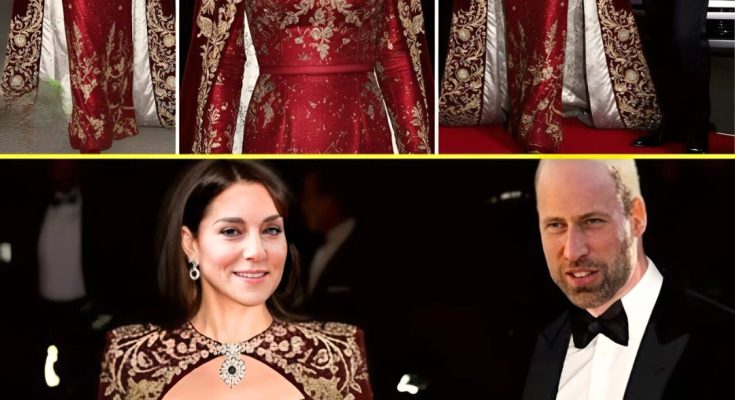 At the French State Banquet honoring President Emmanuel Macron, Catherine stunned in a deep crimson silk crepe cape gown by Sarah Burton for Givenchy. The structured shoulders flowed into soft pleats, creating fluid movement with every step. The ceremonial red hue symbolized unity and diplomacy. She accessorized with Queen Mary’s Lover’s Knot tiara, diamond earrings, and a lily-of-the-valley clutch embroidered in silver thread—adding tenderness to the grandeur. Her presence exuded quiet authority as the monarch-in-waiting.