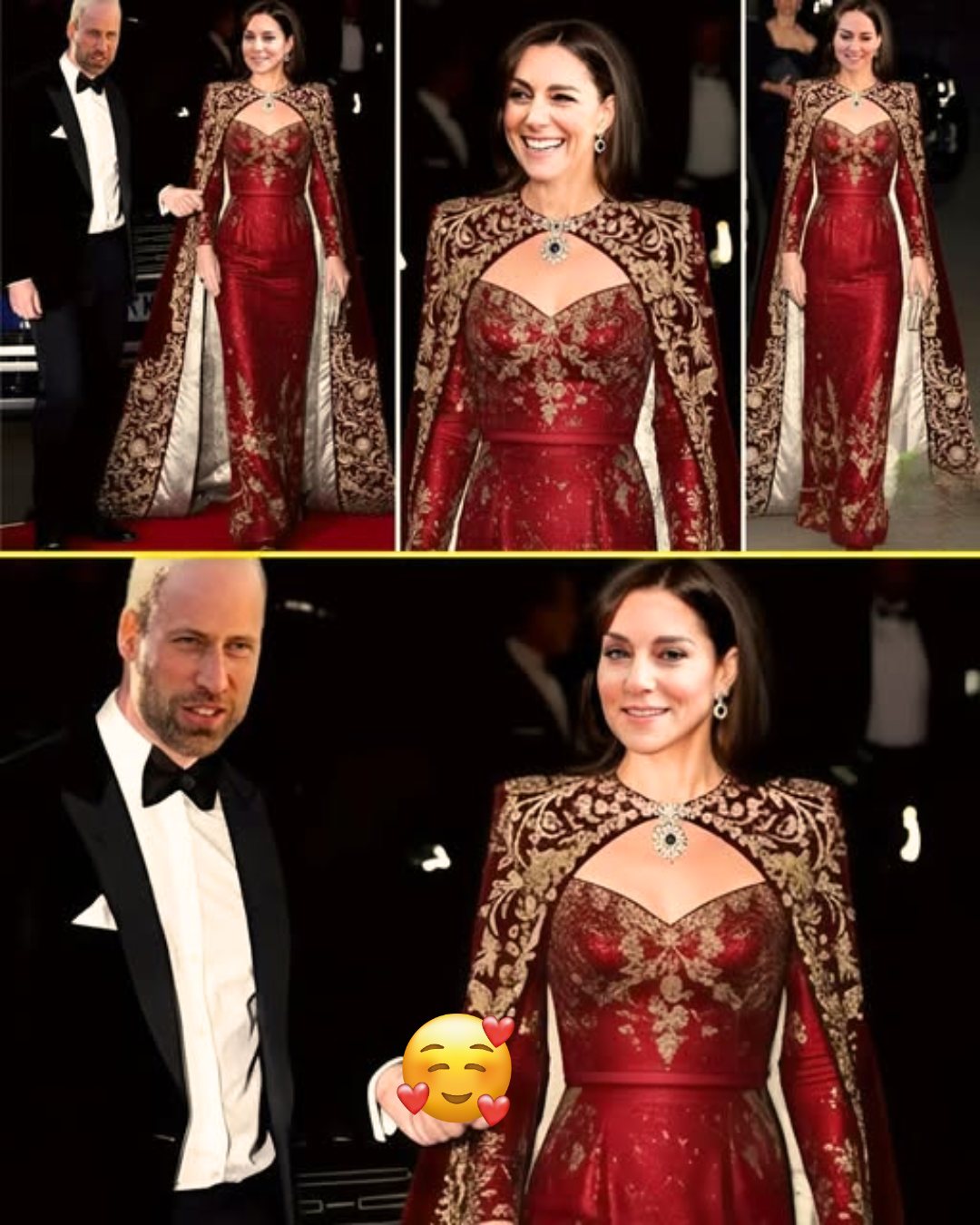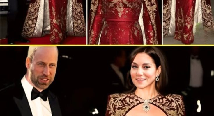 At the French State Banquet honoring President Emmanuel Macron, Catherine stunned in a deep crimson silk crepe cape gown by Sarah Burton for Givenchy. The structured shoulders flowed into soft pleats, creating fluid movement with every step. The ceremonial red hue symbolized unity and diplomacy. She accessorized with Queen Mary’s Lover’s Knot tiara, diamond earrings, and a lily-of-the-valley clutch embroidered in silver thread—adding tenderness to the grandeur. Her presence exuded quiet authority as the monarch-in-waiting.