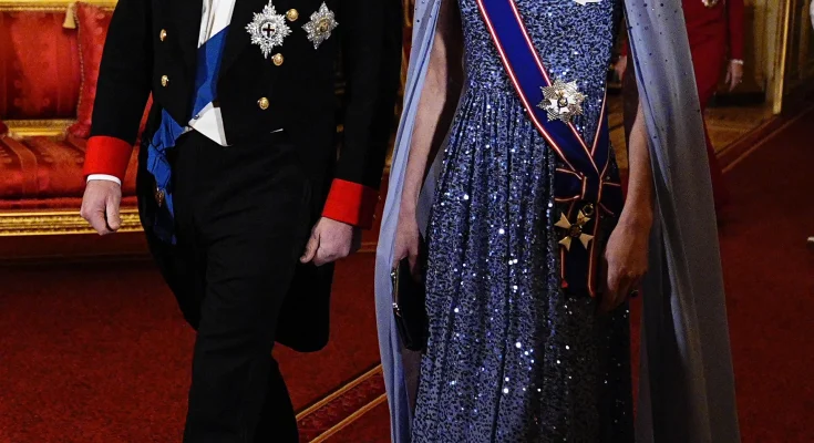 The Princess of Wales sparkled in a blue caped gown by Jenny Packham for a state banquet at Windsor Castle held in honour of German president Frank-Walter Steinmeier and his wife Elke Büdenbender.