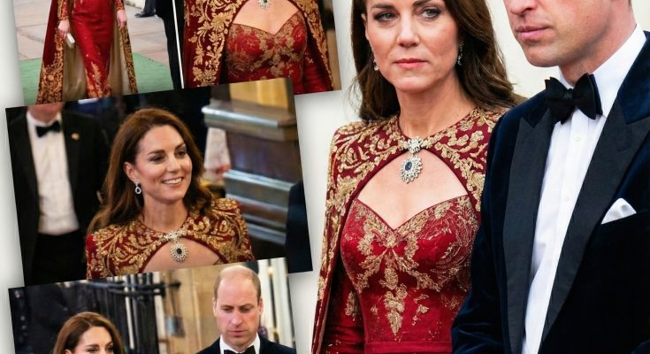 At the French State Banquet honoring President Emmanuel Macron, Catherine stunned in a deep crimson silk crepe cape gown by Sarah Burton for Givenchy. The structured shoulders flowed into soft pleats, creating fluid movement with every step. The ceremonial red hue symbolized unity and diplomacy. She accessorized with Queen Mary’s Lover’s Knot tiara, diamond earrings, and a lily-of-the-valley clutch embroidered in silver thread-adding tenderness to the grandeur. Her presence exuded quiet authority as the monarch-in-waiting. Royal Variety Performance, November 2023 Days after welcoming South Korea’s President Yoon Suk Yeol, Catherine graced the Royal Albert Hall in a teal Safiyaa “Destiny” gown. Split sleeves and a crystal collar formed a subtle cape, framing her shoulders like a halo of light. Padded structure and precise tailoring conveyed empowerment, softened by pearl earrings and suede pumps-a modern heroine on the red carpet.