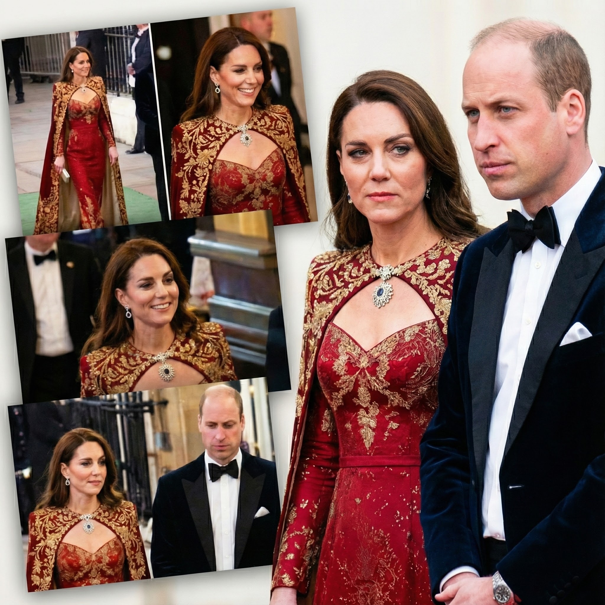 Heavily pregnant with Prince Louis, Catherine wore a blush pink Alexander McQueen cape gown at an Oslo gala. Delicate silk chiffon flowed around her, with a crystal floral neckline reflecting soft candlelight. The Queen’s wedding-day diamond earrings added ethereal beauty. Across these moments, the cape has become Catherine’s emblem-not just style, but emotional architecture. Red for diplomacy, white for renewal, gold for triumph: each hue reveals her public persona and private resilience. Through silhouette, movement, and light, she weaves a story of modern royalty in fabric, carried with timeless grace.